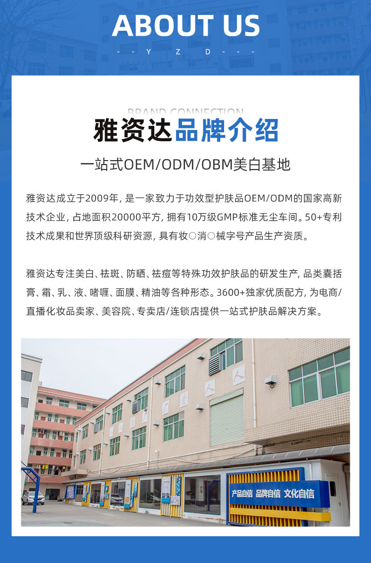 雅資達(dá)是一個(gè)護(hù)膚品代工品牌,專注于為護(hù)膚品和化妝品提供一站式服務(wù)。他們特別擅長生產(chǎn)美白產(chǎn)品,從產(chǎn)品的想法到最終生產(chǎn)制造,都由他們來實(shí)現(xiàn),確保每款產(chǎn)品都有高品質(zhì)和創(chuàng)新的元素。